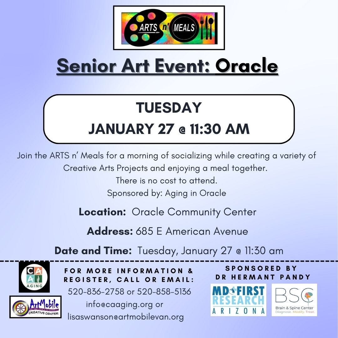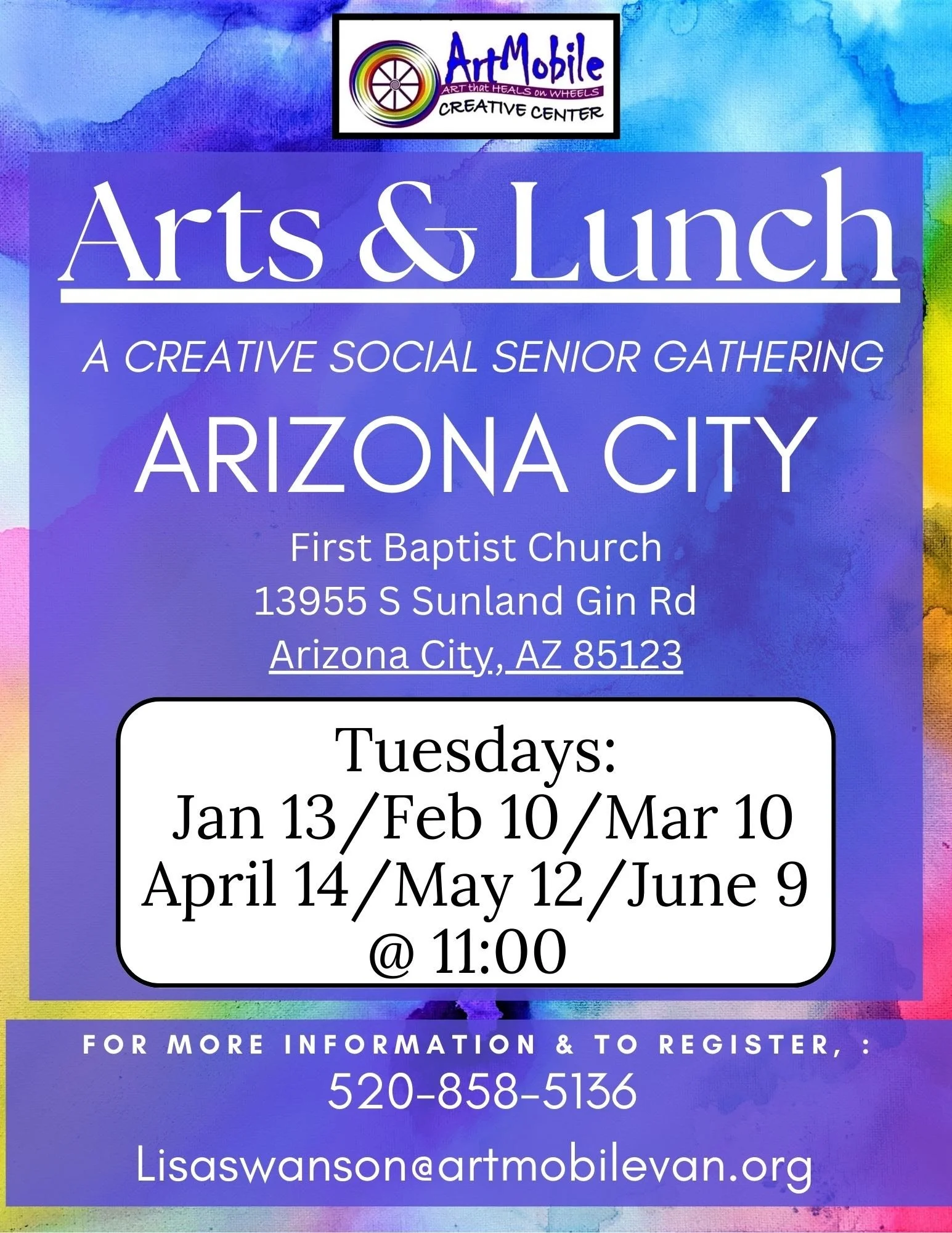 Partnering with Central Arizona Aging for their Arts n’ Meals program, ArtMobile is contracted for program and project design and facilitating sessions. ARTS n’ MEALS pairs creative and social engagements for older adults in remote rural communities that have limited resources. The program focuses on addressing loneliness and social isolation among older adult and special needs populations of all ages, a critical crisis during COVID-19 and after. Research has shown that engaging in creative arts activities, even for short periods of time, reduces stress, enhances coping, and promotes well-being.