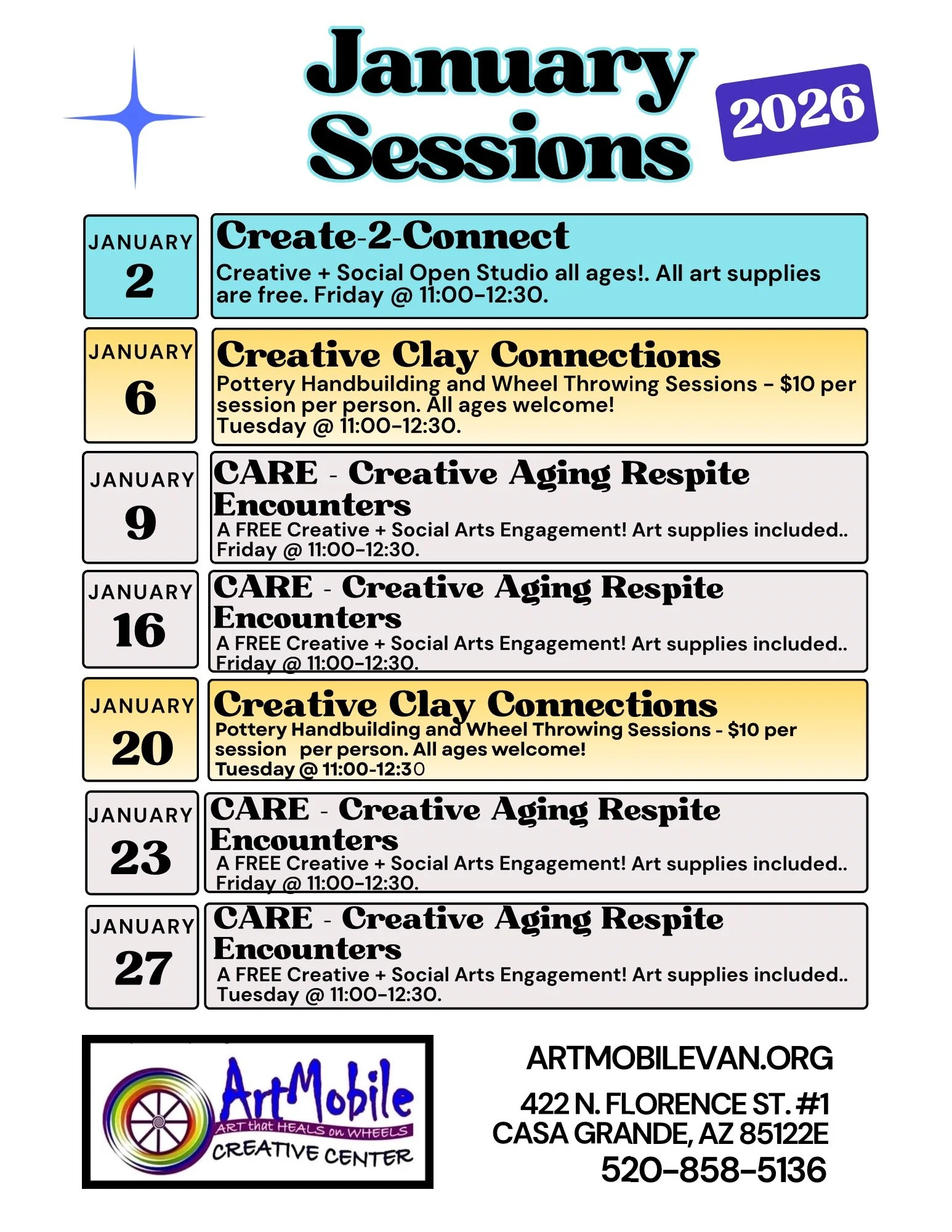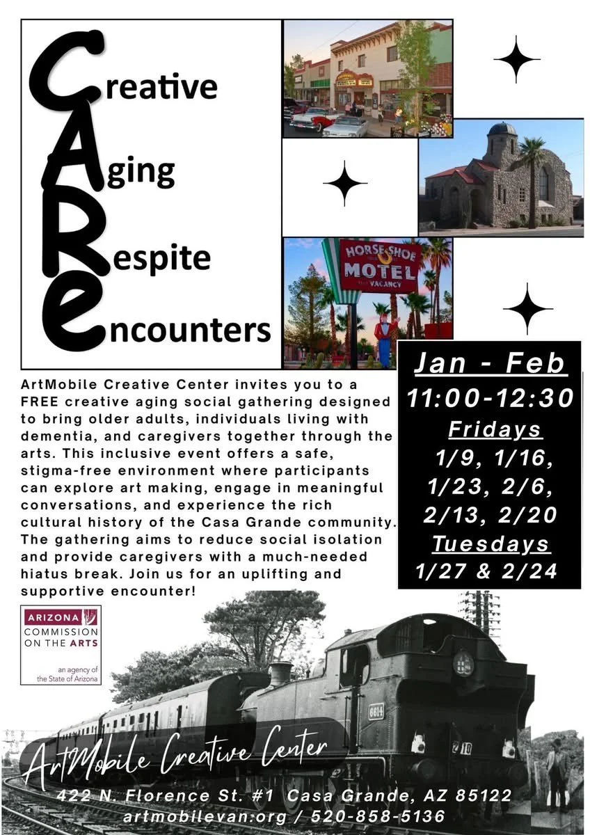 As part of the Arizona Commission on the Arts, Southern Arizona Creative Aging Cohort, ArtMobile launched in 2025, CARE: Creative Aging Respite Encounters. CARE is nine-session, multi-arts pilot project designed to support older adults experiencing social isolation or dementia, along with their caregivers. Grounded in both Arts in Health and Creative Aging practices, CARE centered creativity as a tool for connection, well-being, and meaning-making.