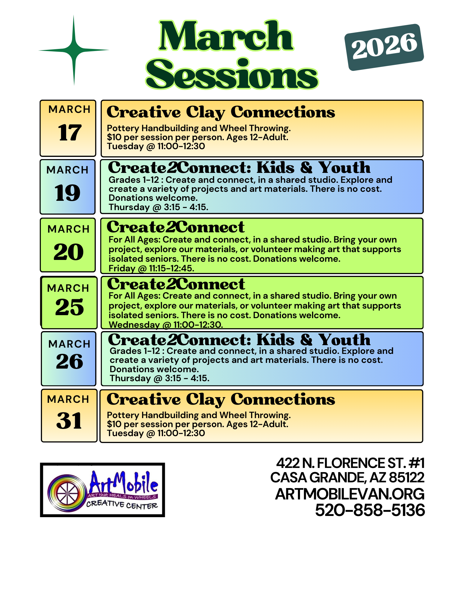 As part of the Arizona Commission on the Arts, Southern Arizona Creative Aging Cohort, ArtMobile launched in 2025, CARE: Creative Aging Respite Encounters. CARE is nine-session, multi-arts pilot project designed to support older adults experiencing social isolation or dementia, along with their caregivers. Grounded in both Arts in Health and Creative Aging practices, CARE centered creativity as a tool for connection, well-being, and meaning-making.